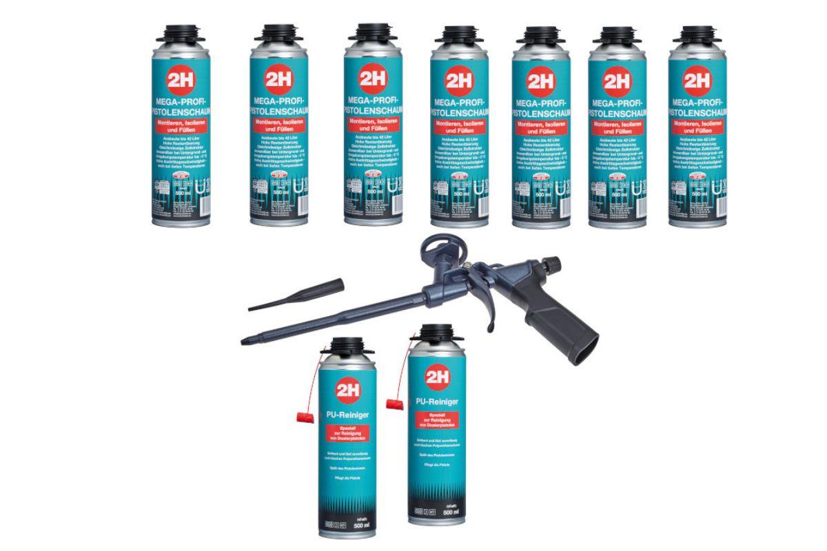 60 x 2H Mega-Pistolenschaum 1-K 500ml mit EC1plus, 42 Ltr. Ausbeute, geprüft bis 59 dB, 2 x PU-Reiniger P 500ml für die Pistole und frischen PU-Schaum, 1 hochwertige Schaumpistole vollteflonisiert. Einkomponenten-Polyurethanschaum für Schaumpistolen zur professionellen Montage, Abdichtung und Schalldämmung. 2H Mega Pistolenschaum erhärtet bei Kontakt mit Luftfeuchte. geeignet zur Montage von Holz-, PVC- und Aluminium-Fenstern und -Türen, Fensterbänken, Treppen, Bade- und Duschwannen. Der besonders dichte und beständige 1-K-Pistolenschaum weist hohe Bindekraft auf und eignet sich sehr gut zum Abdichten, Dämmen, Verkleben und Isolieren. 2H Mega-Pistolenschaum weist auch sehr gute Lärm- und Wärmeschutzeigenschaften auf und härtet sehr schnell aus, womit die Einbauzeit verkürzt wird. Die Ergiebigkeit ist vonder Temperatur und der Umgebungsfeuchtigkeit abhängig. Der Schaumstoff weist hohe Resistenz gegen Pilz- und Schimmelbefall auf. Die Applikation des Schaumstoffs erfolgt mit Einsatz von einer speziellen Pistole zur Applikation von Polyurethanschaumstoffen. Zusätzlich erhalten Sie einen sehr guten 2H Reiniger P für die Schaumpistole, um Verklebungen zu entfernen und zum Entfernen von frischem PU-Schaum auf dem Bauteil.