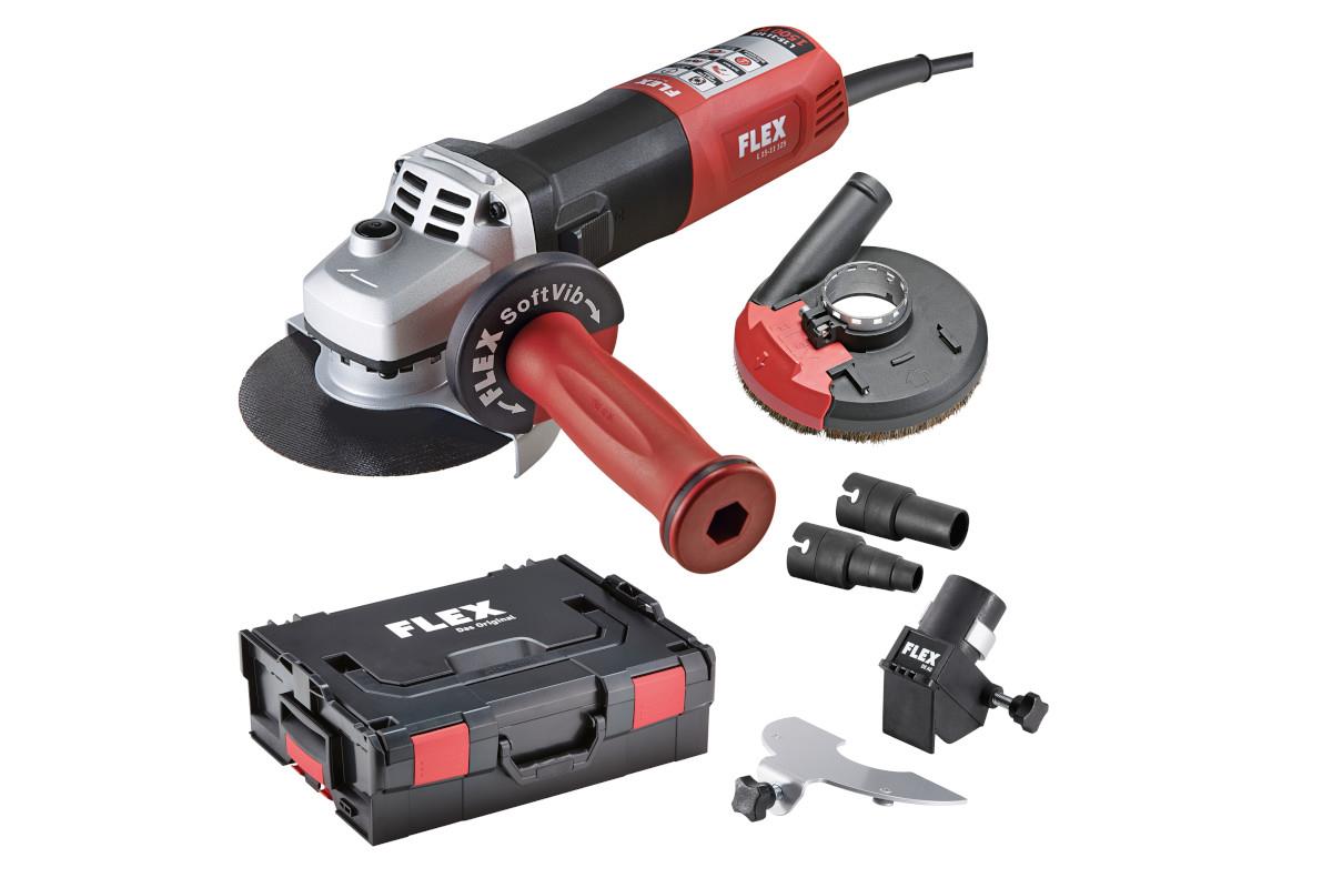 Durchmesser 125mm. Eine effektive Luftführung und optimierte Kohlengeometrie sorgen für eine hohe Lebensdauer. Aufwändige Staubabdichtung von Motor und Getriebe. Kompakte und ergonomische Bauform. Ergonomische Arm-Arbeitshaltung durch schräg montierten Seitenhandgriff Werkzeuglos verstellbare Schutzhaube. Mit arretierbarer Schiebeschalter und Spindelarretierung. Universeller Winkelschleifer für die Stahl-/Metallbearbeitung, Bau/Renovierung, Karosseriebau sowie für Montagebetriebe. SoftVib-Handgriff mit integriertem, patentierten Spannmutternschlüssel und Vibrationsdämpfung. Hinweis: bei Zubehör auf die maximale Drehzahl des Werkzeuges achten Flex-Nummer: 501638 Mitgeliefertes Zubehör: Schutzhaube 125 Ø , SoftVib-Handgriff, Spannflansch, Spannmutter M15, Koffer (L-Boxx) , Absaug-Set.