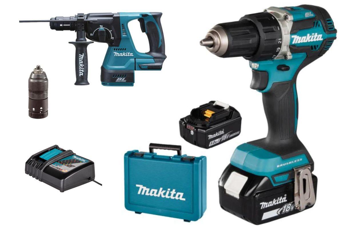 Kompakter 18V Akku-Bohrschrauber mit einer Gehäuselänge von nur 172 mm. Das Drehmoment ist in 21 Stufen einstellbar. Der bürstenlose Motor ermöglicht die kompakte Bauform und sorgt für effizienteren Umgang mit der Energie. 54Nm. Makita Akku Kombihammer DHR243Z gibt es dazu! Bürstenloser Kombihammer zum Meißeln, Bohren und Hammerbohren. Mit Schnellwechselfutter und die Einzelschlagstärke erreicht bis zu 2,0 Joule, in Beton beträgt die Bohrleistung bis zu 24 mm. Lieferumfang: 2 Akkus 18V/5,0Ah, Akku Kombihammer DHR243Z, Ladegerät, Transportkoffer.