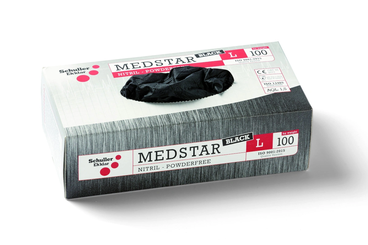 Box mit 100 Stück Medstar Nitril-Handschuhen zum Einmalgebrauch. Größe L. Erhältlich im Farbton schwarz.