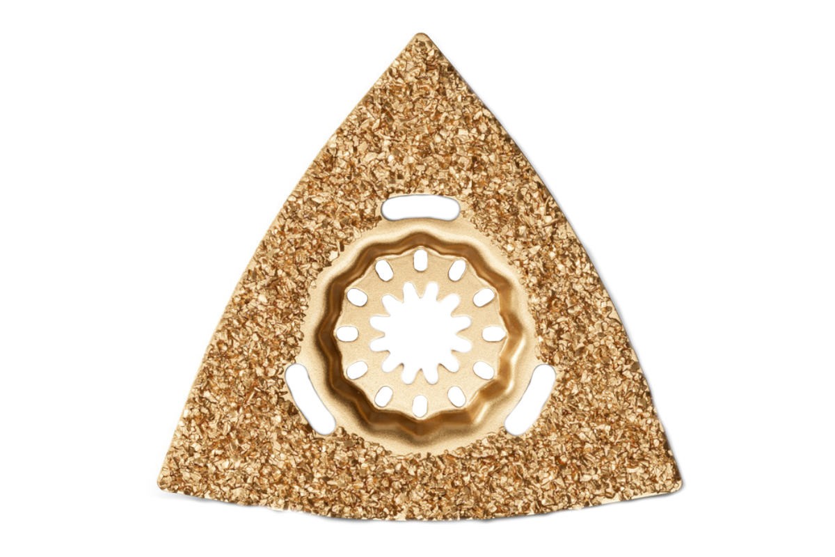 Zum Grobschliff von Spachtelmasse, Fliesenkleber, Beton, Stein und Holz. Für besonders hohen Arbeitsfortschritt und die sinnvolle Bearbeitung von mehreren Quadratmetern. Dreiecksform, Kantenlänge 110mm, gelocht, auch mit Staubabsaugung einsetzbar. Aufnahme STARLOCK MAX. Für alle Fein Multitools und sonstige Multitools mit StarlockMax-Werkzeugaufnahme. Fein-Nummer: 63731006210