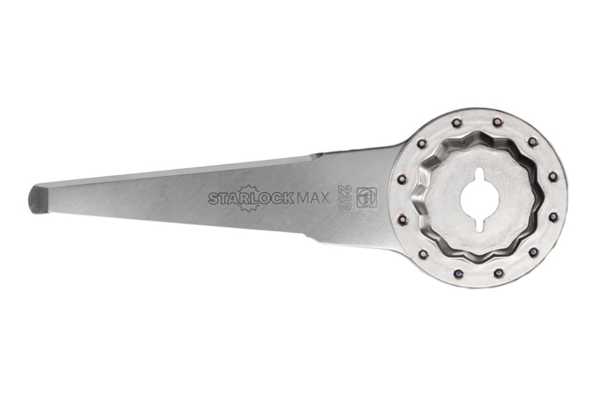 Universell einsetzbares Messer für fast alle Dehnfugen. Gerade Form. 60mm Schnitttiefe und 30mm breit. Aufnahme STARLOCK MAX. Abnahme pro Pack. Für alle Fein Multitools und sonstige Multitools mit StarlockMax-Werkzeugaufnahme. Fein-Nummer: 63903236230