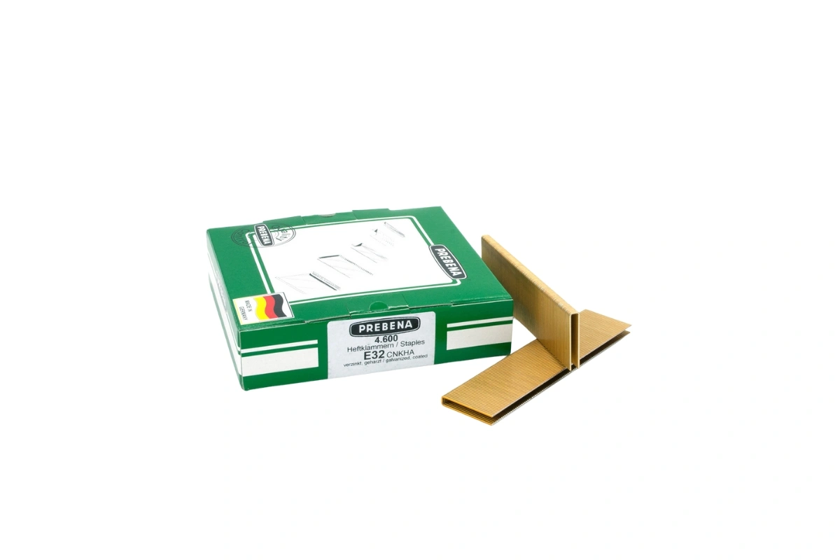 Prebena 32mm Heftklammern Typ E, verzinkt, geharzt. 4.600 Stück pro Schachtel. Rückenbreite (mm) 5,7, Drahtmaß (mm) 1,0 x 1,25. Mengenangabe pro Schachtel. Wird verarbeitet in: Druckluftnagler 3GP-E40 15-40mm