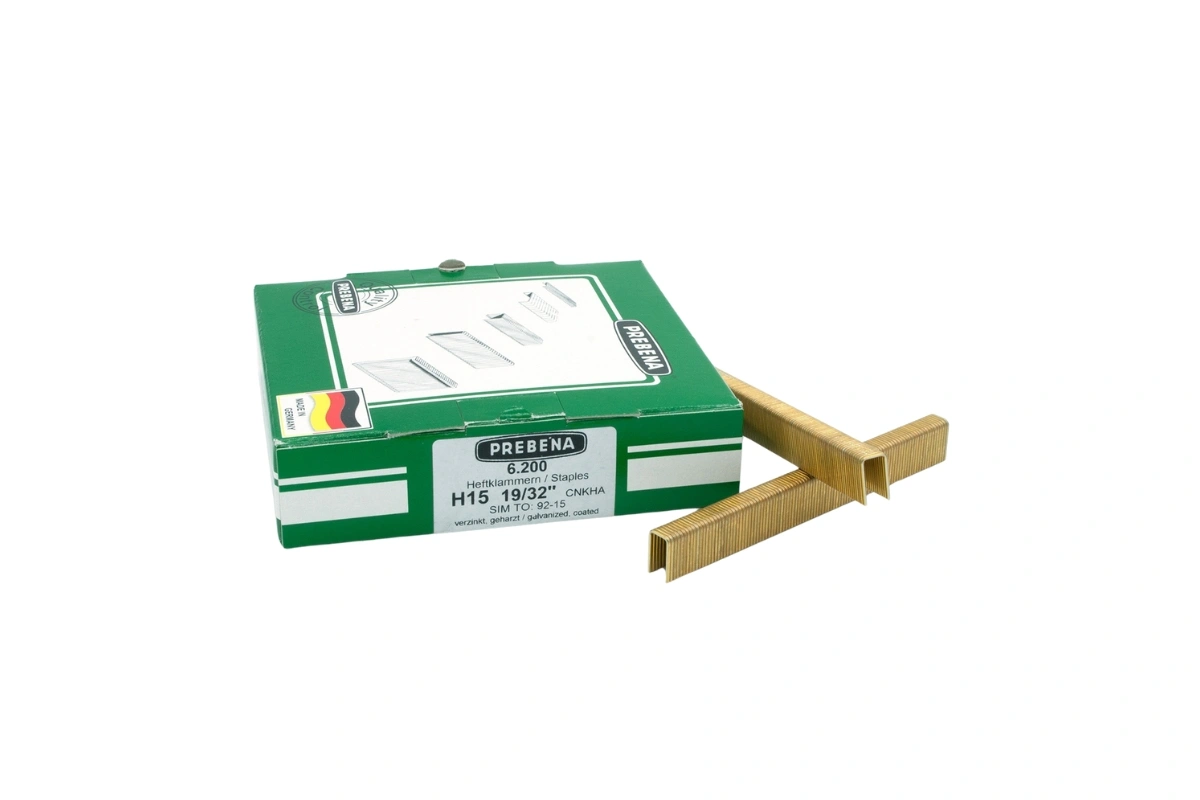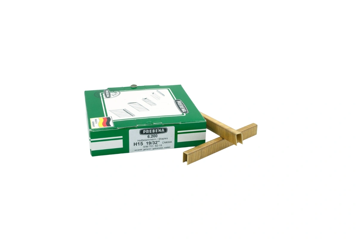 Prebena 15mm Heftklammern Typ H, verzinkt, geharzt. 6.200 Stück pro Schachtel. Rückenbreite (mm) 8,6, Drahtmaß (mm) 1,0 x 1,25. Mengenangabe pro Schachtel. Wird verarbeitet in: Druckluftnagler 3GP-H40 15-40mm Druckluftnagler 2P-H30SD 12-30mm