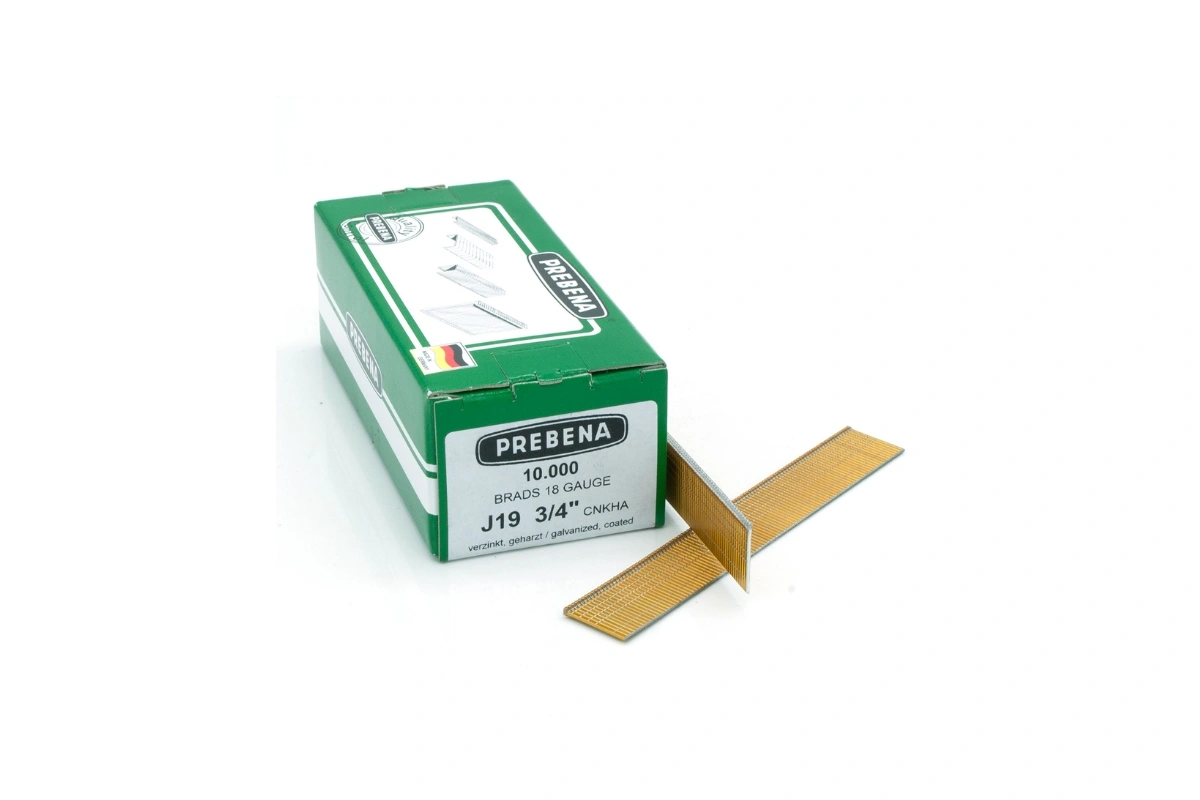 Prebena 19mm Stauchkopfnägel (Brads) verzinkt Stahl, geharzt. 10.000 Stück pro Schachtel. C-Schnitt, Drahtmaß (mm) 1,0 x 1,25, Nagelkopf (mm) 2,0 x 1,0. Mengenangabe pro Schachtel. Wird verarbeitet in: Druckluftnagler 2P-J50SDS Glasleistennagler 2P-J50SVN-T Druckluftnagler 2XR-J50 Druckluft-Kartuschennagler PKT-2-J50SD-SVN Druckluft-Kartuschennagler PKT-2-J50SD-S Combi-Druckluftnagler 2P-J/ES40COMBI