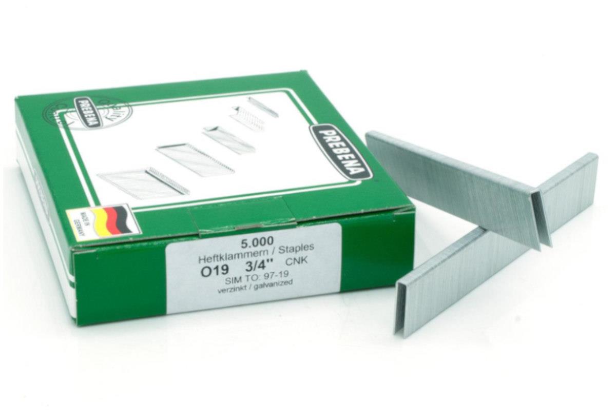 Prebena 19mm Heftklammern Typ O, verzinkt. 5.000 Stück pro Schachtel. Rückenbreite (mm) 4,5, Drahtmaß (mm) 0,66 x 0,95. Mengenangabe pro Schachtel. Wird verarbeitet in: Druckluftnagler 1M-O25SDS-S10 8-25mm