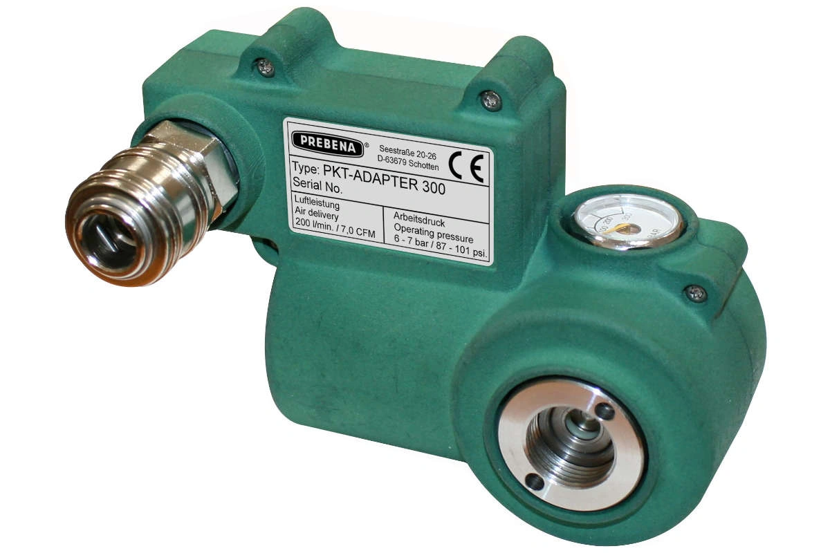 Prebena Adapter für den Anschluss von Druckluftgeräten bis 10 bar. Einfache Handhabung und schnell montiert: Druckluftkartusche in den Adapter schrauben, Adapter an das Druckluftgerät anschließen, einsatzfertig. Unbegrenzte Einsatzmöglichkeiten für alle druckluftbetriebenen Werkzeuge. Einfacher Anschluss von Druckluftgeräten an PREBENA Druckluftkartuschen KT-1000: ohne Druckluftschlauch einsetzbar, anschlussfertig, Füllstandsanzeige der Kartusche, klein und handlich, wetter- und temperaturunabhängig, Schnellkupplung für einfaches Anschließen